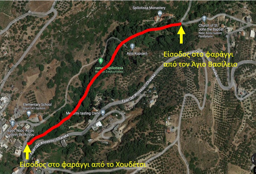 φαραγγιού είναι από το Χουδέτσι και διασχίζοντας ένα πανέμορφο μονοπάτι με πυκνή βλάστηση, ένα γεφυράκι και το ποταμάκι που ρέει (κυρίως τους χειμερινούς μήνες), καταλήγει στο Μοναστήρι της Παναγίας της Σπηλιώτισσας.